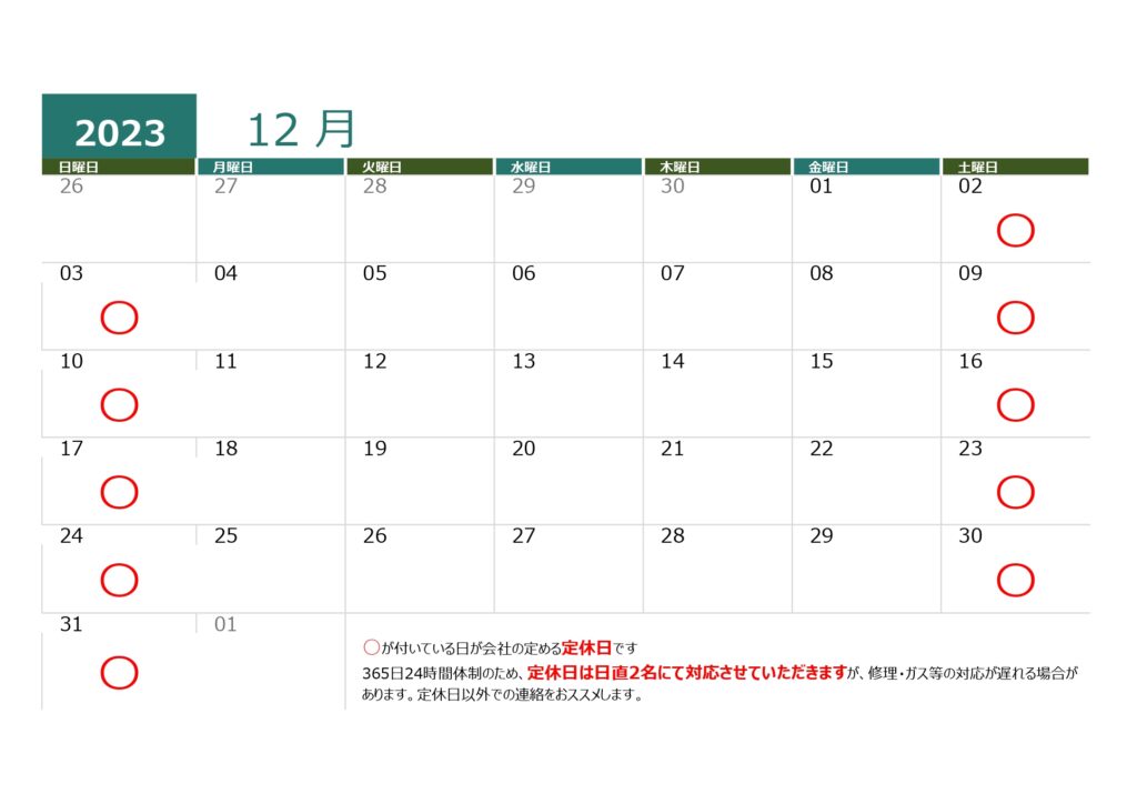 三宅産業は365日24時間体制ですので、下記カレンダーの赤〇の日も通常通り営業致しております。