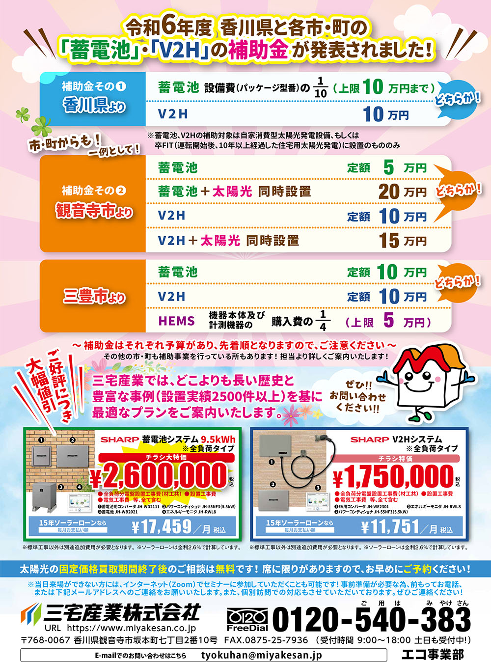 これまで三宅産業では、『太陽光の活用方法』としまして、香川県内でセミナーを約6年前から開催してまいりました。ご参加頂いた方からは、『貴重な情報が聞けて大変良かった。』と喜んで頂いております。そのようなことから、今回も『太陽光活用相談会』を開催する事となりました。